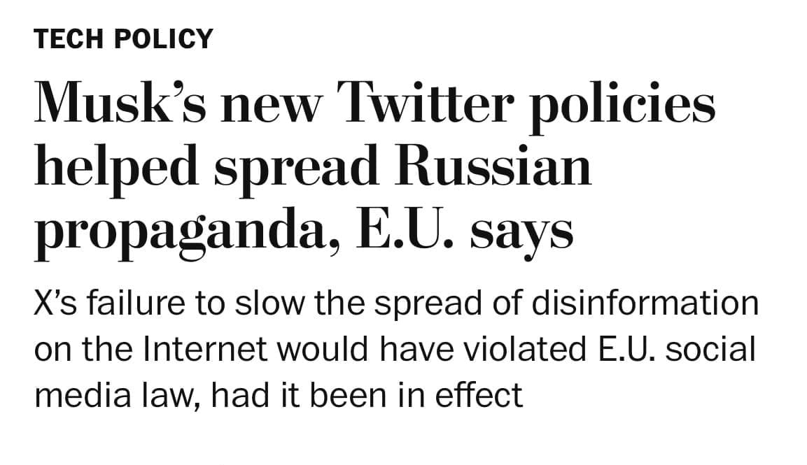 Washington Post (2023): Musk's Policies Helped Spread Russian Propaganda, says E.U.