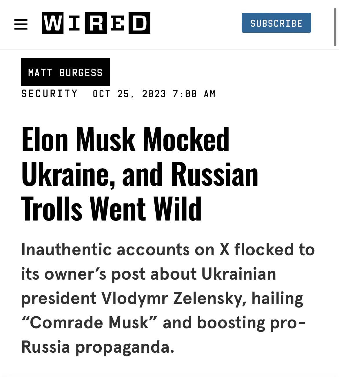6: Wired (2023): Elon Musk Mocked Ukraine, and Russian Trolls Went Wild