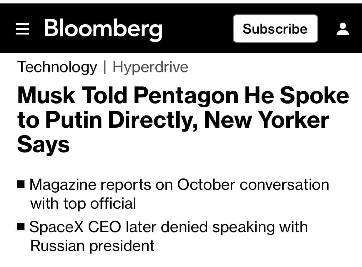 7: Bloomberg (2023): Musk Told Pentagon He Spoke to Putin Directly, New Yorker Says
