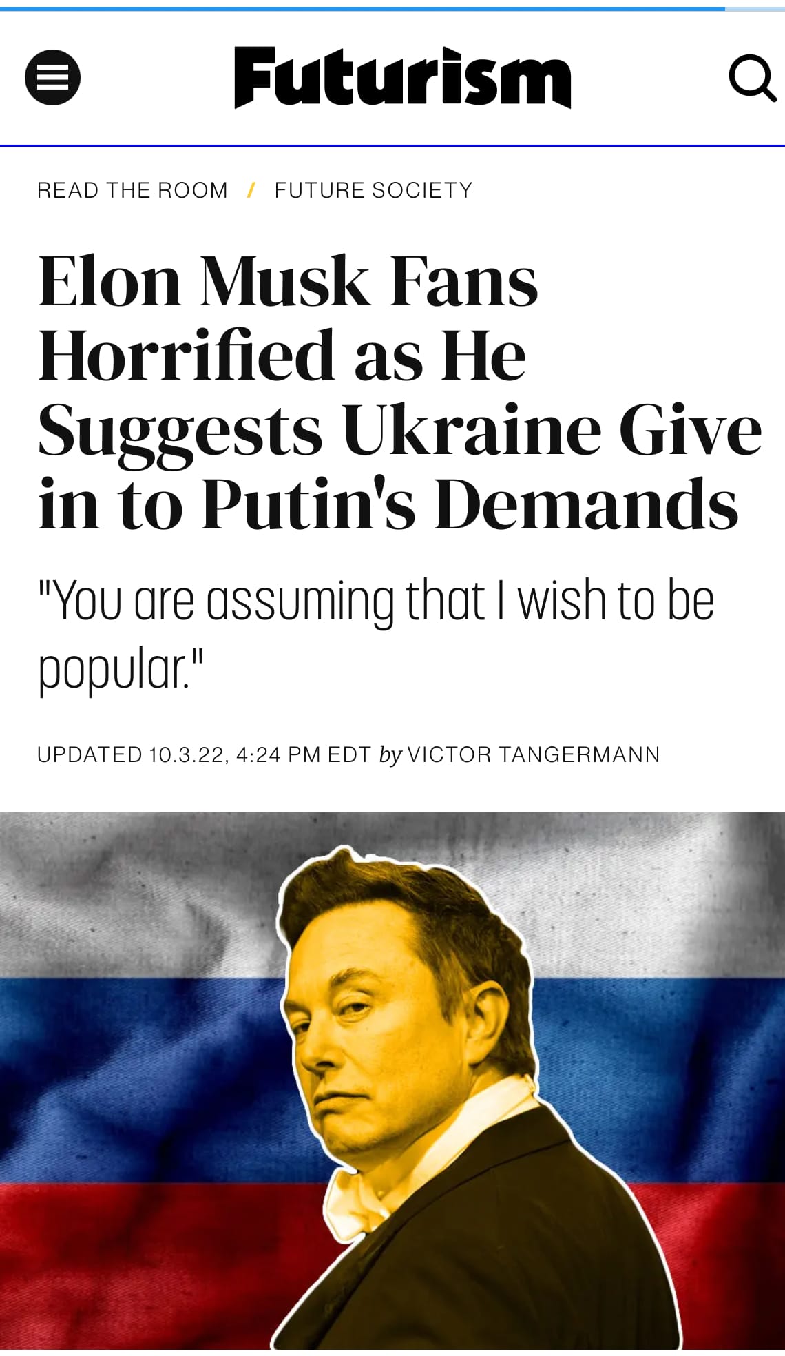 3: Futurism (2022): Elon Musk Fans Horrified As He Suggests Ukraine Give in to Putin's Demands