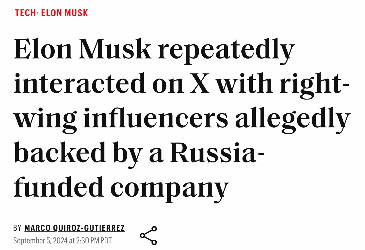 15: Fortune (2024): Elon Musk Repeatedly Interacted With Influences Allegedly Backed by Russia-Funded Company