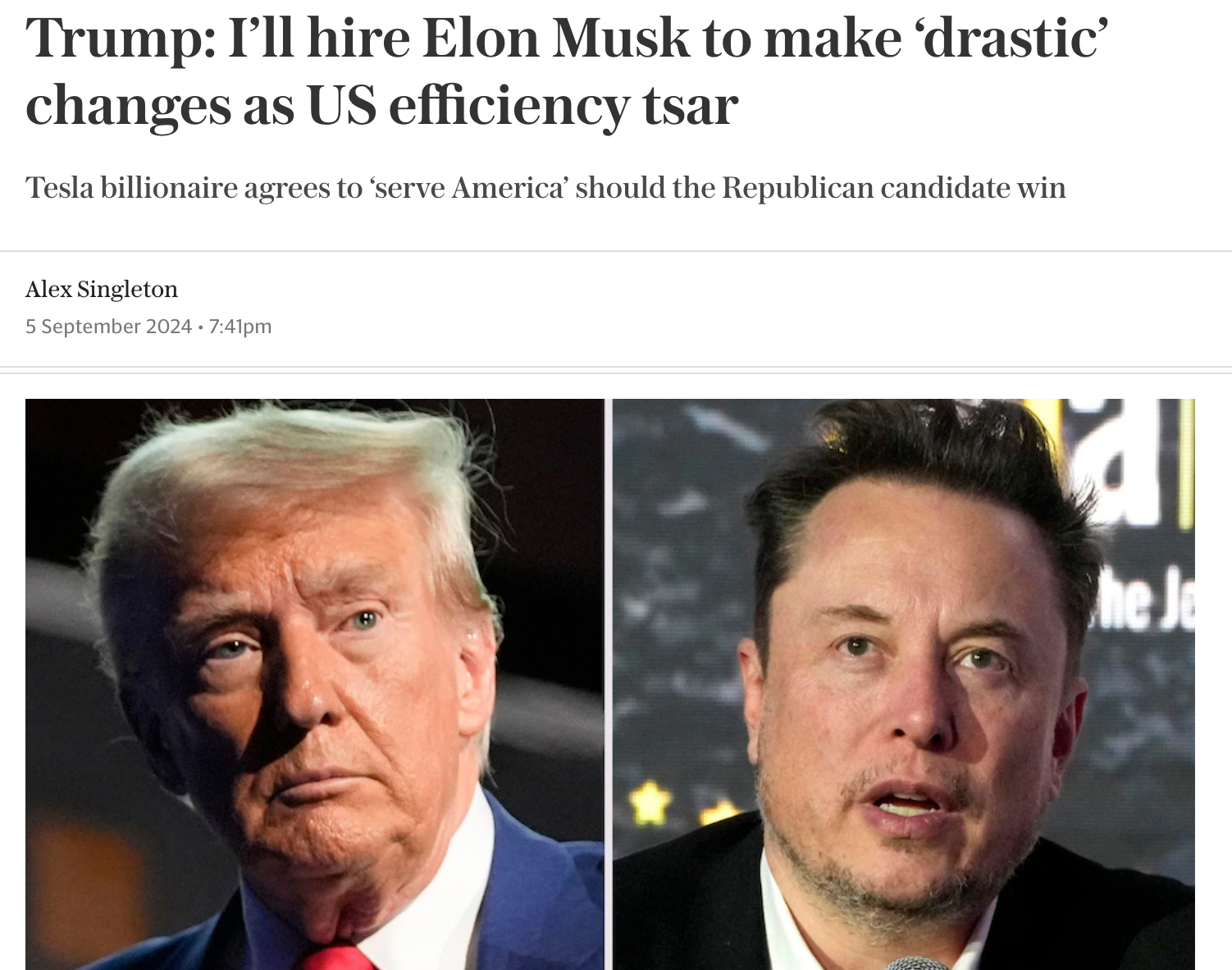 16: U.K. Telegraph (2024): Trump will Hire Elon Musk as US efficiency 'tsar'