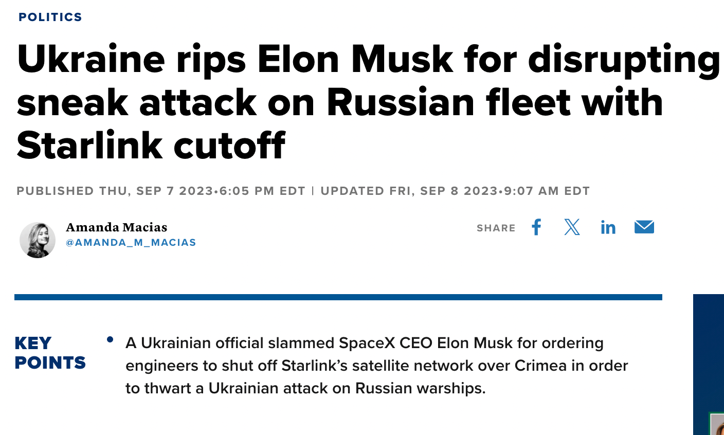 8: CNBC (2023): Ukraine Rips Elon Musk For Disrupting Sneak Attack on Russian Fleet with Starlink Cutoff