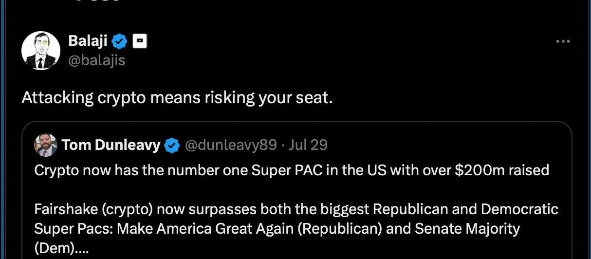 "Attacking crypto means risking your seat," declared Balaji Srinivasan, the former chief technology officer of Coinbase who is also the chief voice of the Network State cult. (He's also the guy who wants tech bros in San Francisco to form a gray-clad tribe and partner with the police to purge Democrats from the city.)