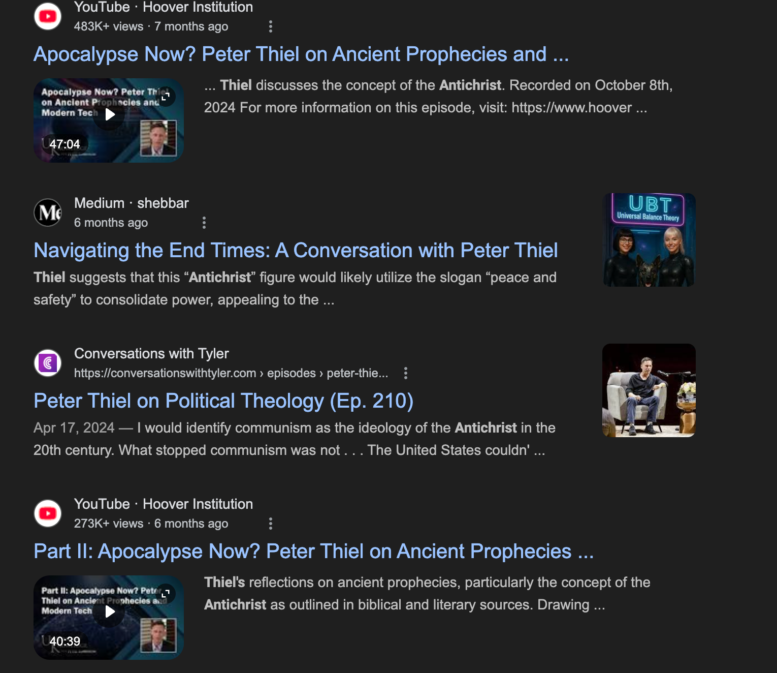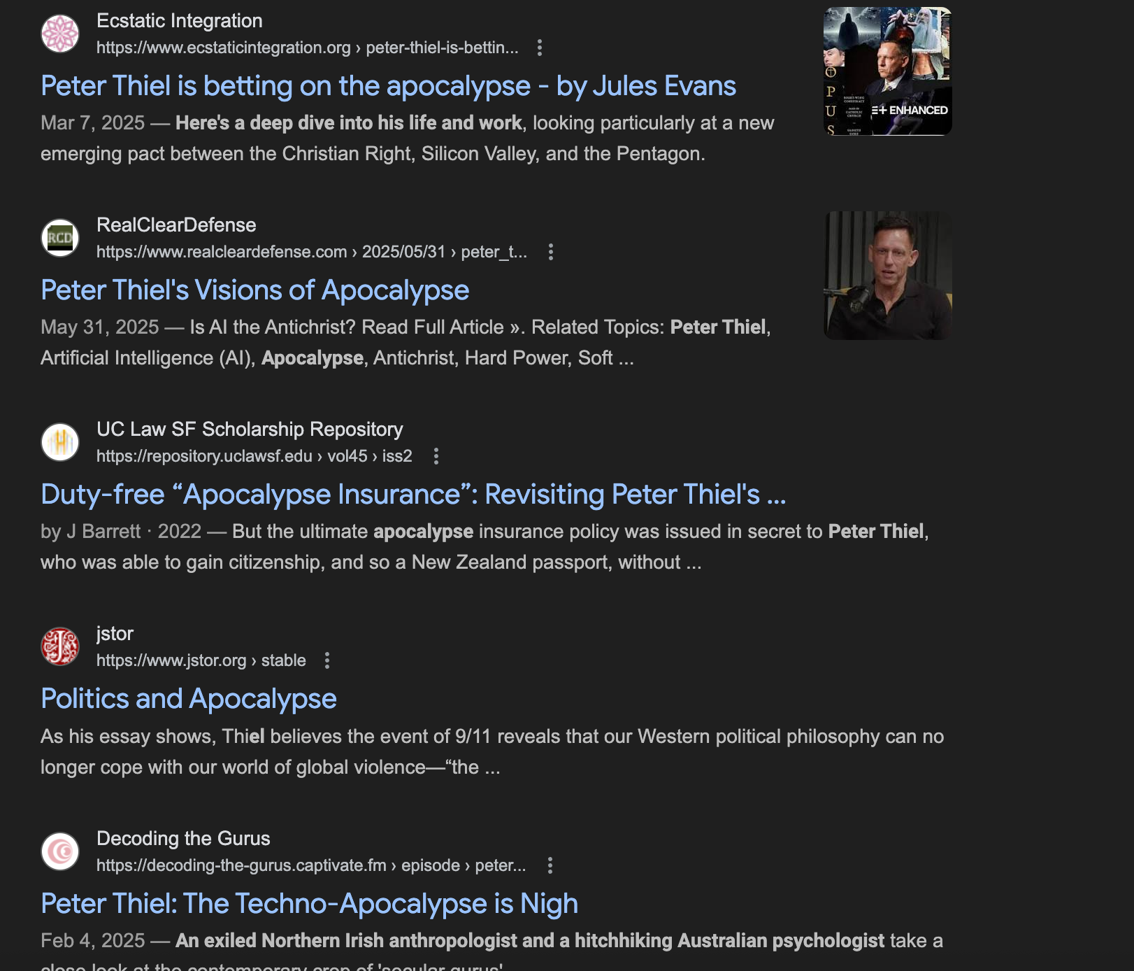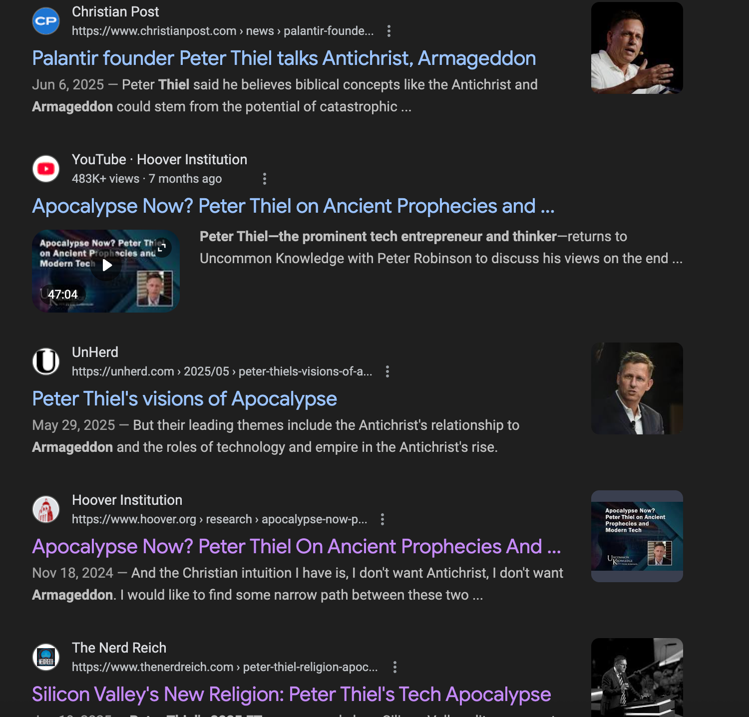 A quick search for the terms “Peter Thiel” and “Armageddon” and “apocalypse” reveals pages and pages of results. Thiel is thoroughly obsessed with the subject. He appears to be talking about scary End Times, apocalyptic themes, and Antichrist stuff “nonstop” in interviews and on podcasts.