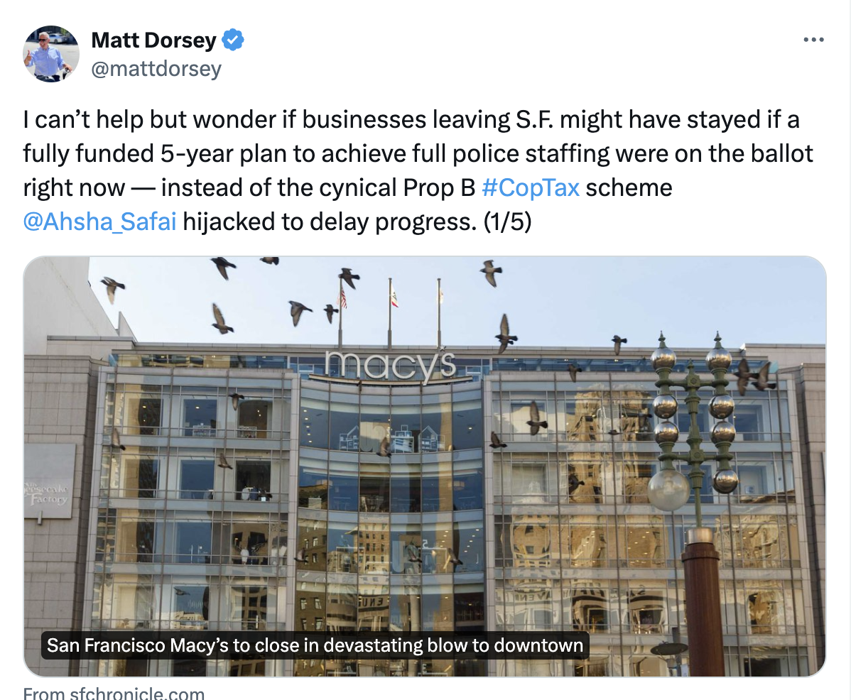 Supervisor Matt Dorsey had an absolutely psychedelic take on the whole matter, claiming that Macy’s might have been saved if his pro-police legislation had passed the Board of Supervisors.