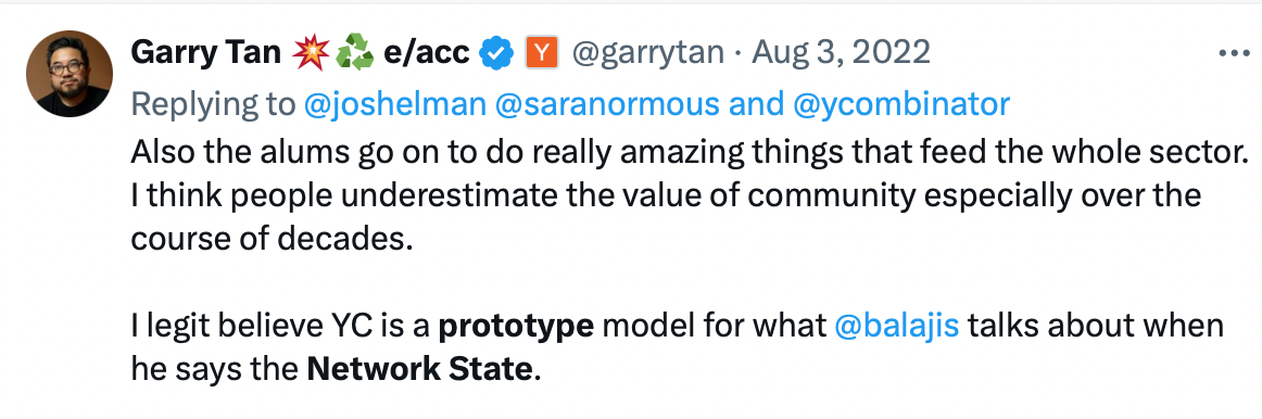 "I legit believe [Y Combinator] is a prototype model for what @balajis talks about when he says the Network State," wrote Tan.