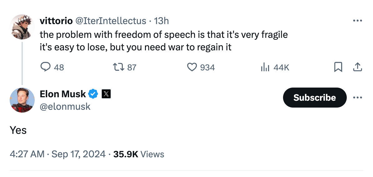 "Yes," replied Musk, knowing full well that Vittorio's big brush with "free speech" involved his public and vicious anti-Black racism.