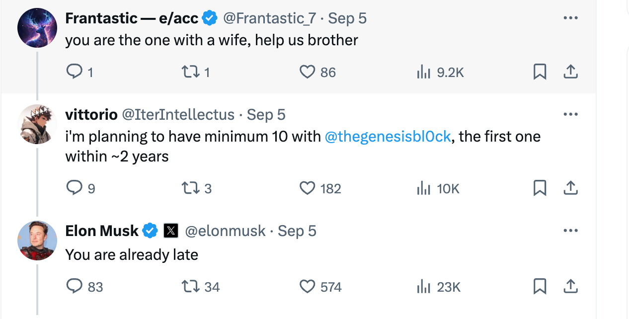 "You are already late," replied Musk, taking time from his busy day running several companies to chime in on an anonymous pro-natalist racist's thread about creating more white babies.